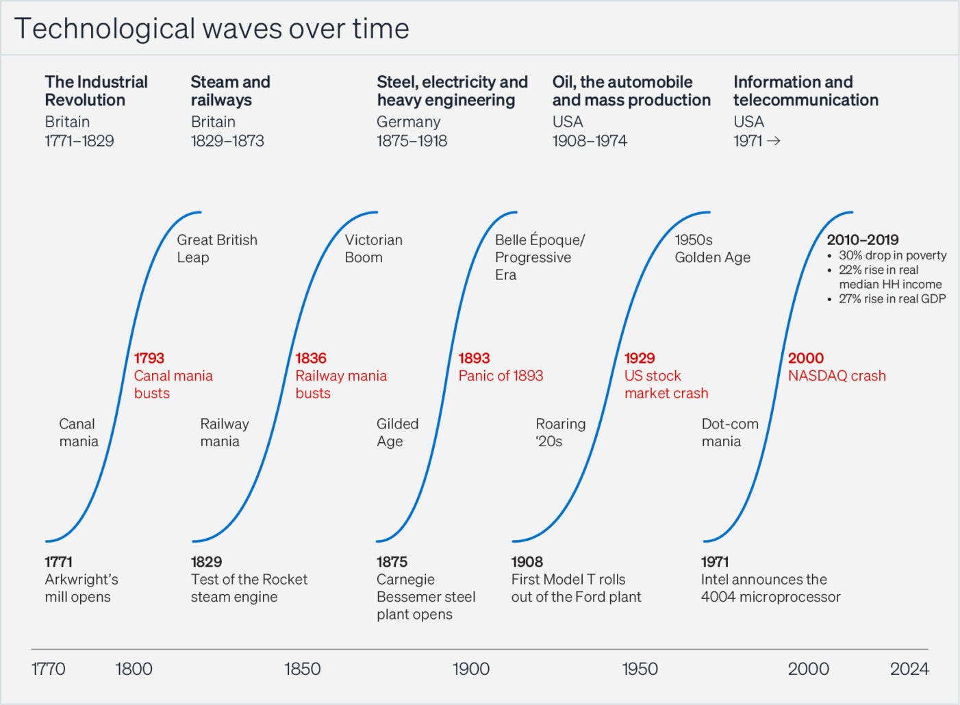 First, a revolutionary technology gets early adoption in niche circles. Over a period of 20 - 40 years, speculative investment by risk-on investors follows, driving widespread deployment of the technology. This eventually leads to overinvestment and ultimately, a big collapse, after which the technology continues to spread and make its impact felt, but eventually matures into a commodity.