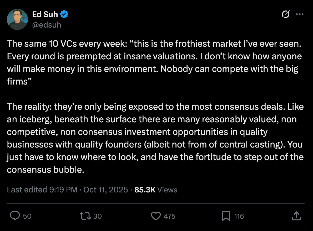 The herd piles in - bigger rounds, monster markups, overnight “successes”. All without any material impact on the underlying value of the companies.