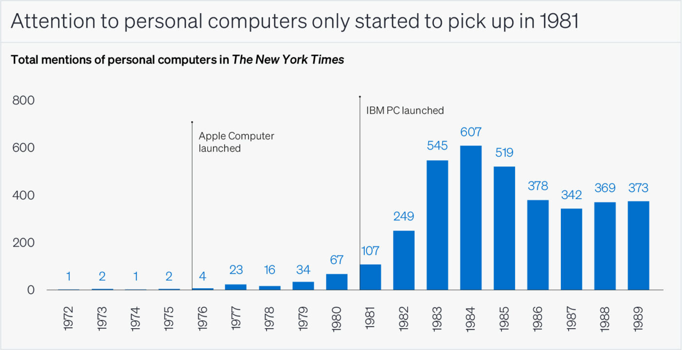 When Apple launched their first computer, nobody gave a shit about computers. Even 7 years later the hype was only getting going.