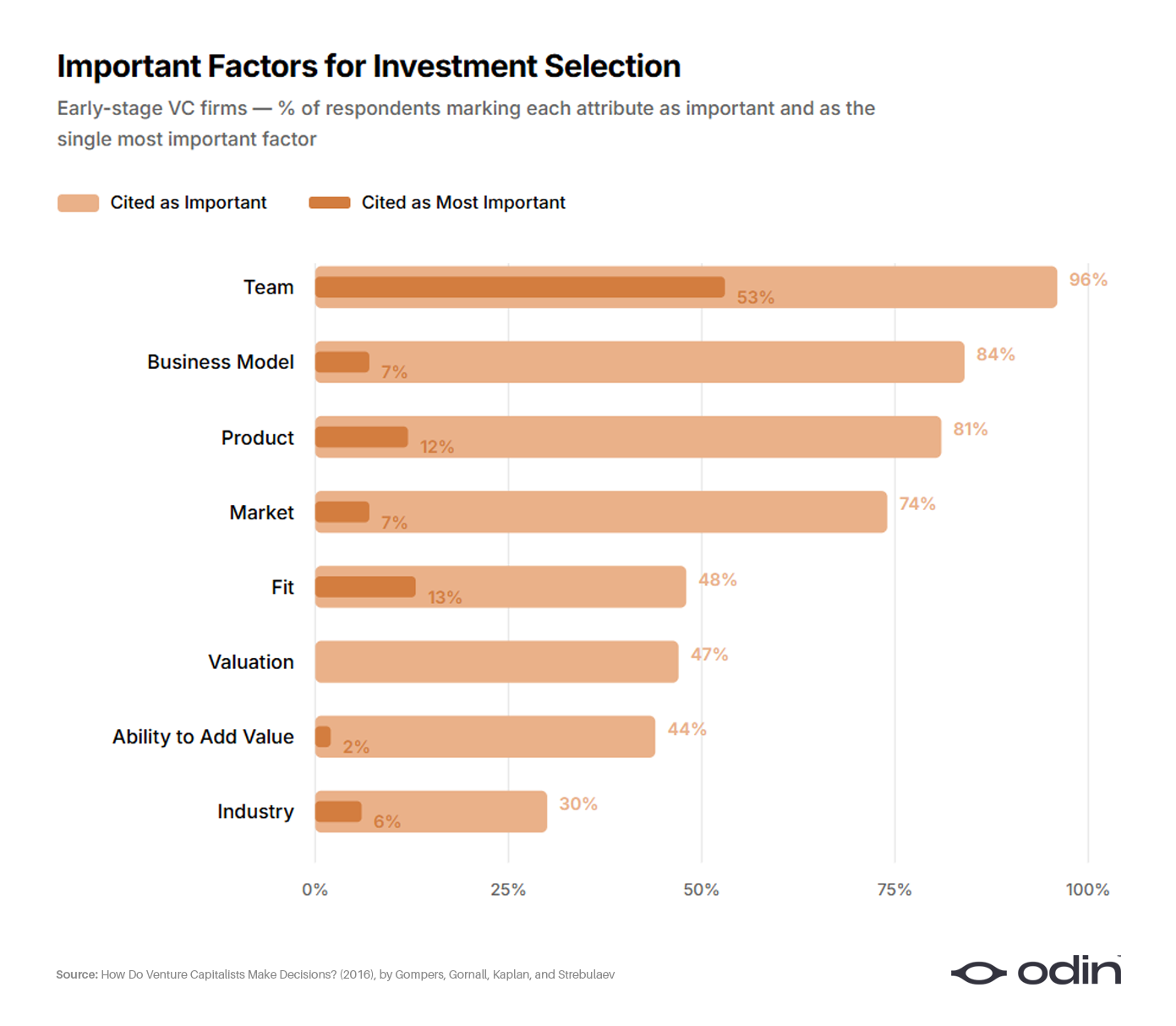 “96% (92%) of VC firms identified team as an important factor and 56% (55%) identified team as the most important factor for success (failure). Team was the most important for all subsamples, but particularly important for early-stage and IT VCs.”