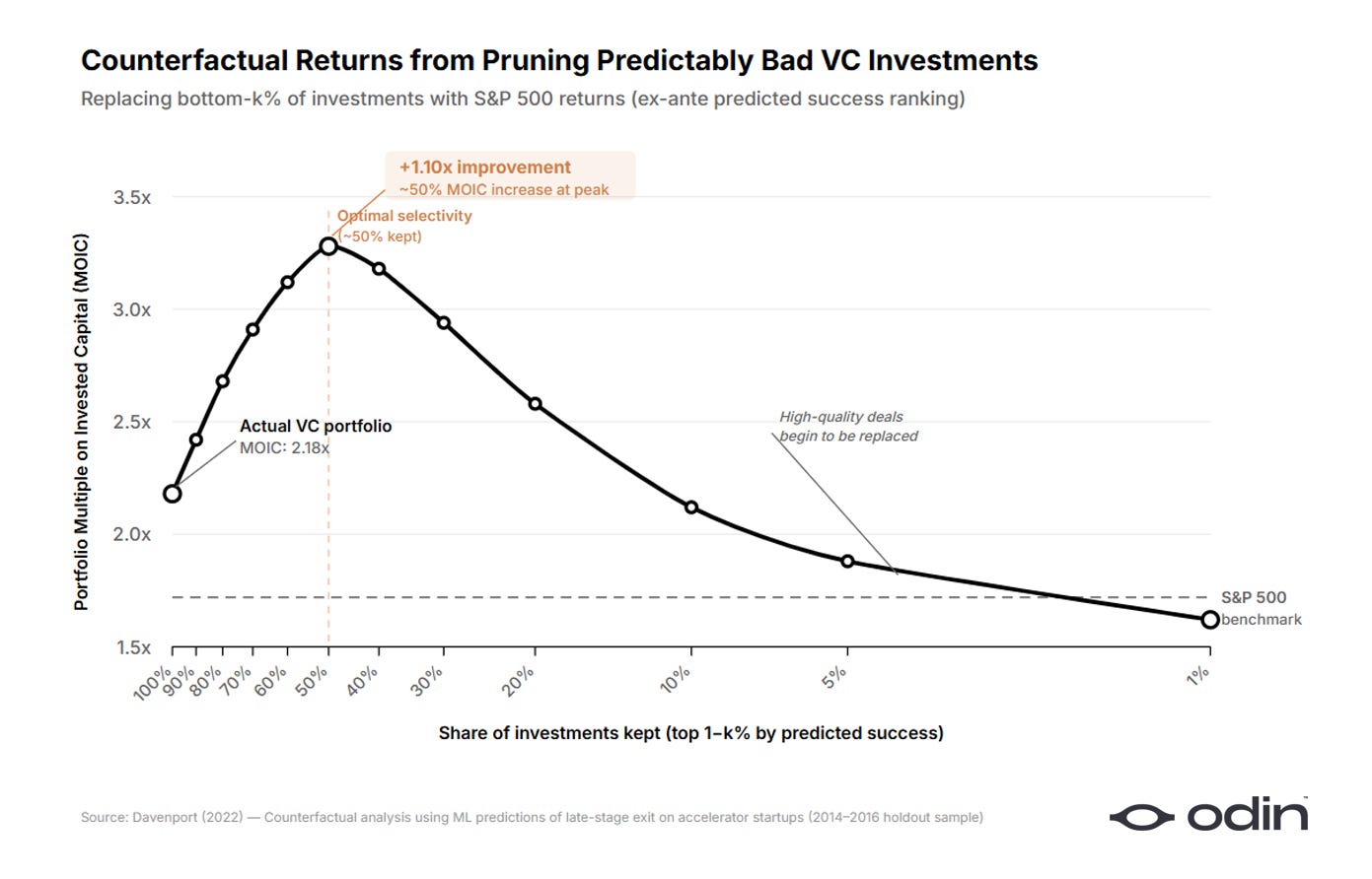 Davenport built a machine-learning model on a dataset of more than 16,000 startups, representing over $9 billion of committed capital. He trained the model only on information that had been available to investors at the time of the decision, and asked how many of the investments that venture capitalists actually made could have been identified, ex ante, as worse than putting the same money into a standard public-market alternative? The answer was approximately half.