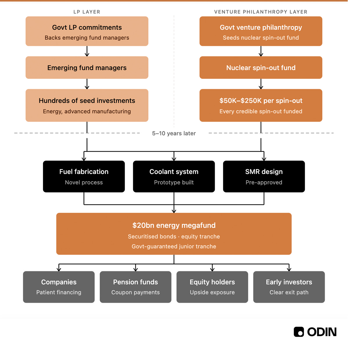 Simultaneously, at the venture philanthropy layer, the government seeds a dedicated fund targeting nuclear technology spin-outs from national laboratories and universities. This fund invests $50,000 to $250,000 in every credible spin-out attempting to commercialise relevant research, regardless of perceived probability of success.