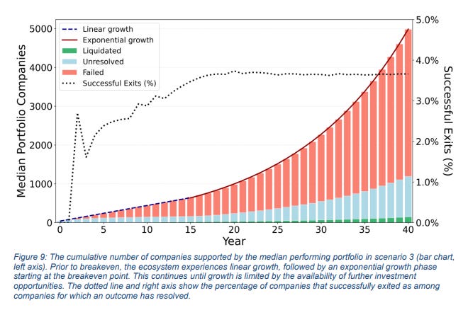 More importantly, once breakeven is achieved, the fund enters an exponential growth phase as returns from successful exits are reinvested into an ever-larger number of new companies, and the ecosystem itself begins to compound. The vast majority of individual investments, over 96%, fail. But the realised value of the successful outliers more than covers the cost of those failures, and the broader economic benefits, in job creation, talent retention, and intellectual property kept within the sovereign jurisdiction, compound well beyond the fund’s direct financial returns.