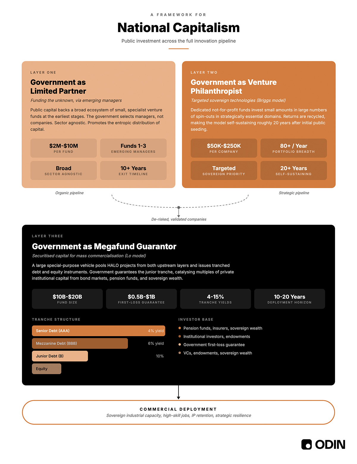 Right now, innovation is unable to channel public investment and large institutions to the points in the pipeline where they will have the most impact. The three-layer model described here (government as LP, government as venture philanthropist, and government as megafund guarantor) offers a blueprint for each stage of the pipeline, from the first hint of an idea in a university laboratory to the deployment of a functioning power plant or manufacturing facility. And it does so in harmony with the private venture capital ecosystem, which stands to benefit at the growth stage from government LP/VC activity catalysing opportunity, and at the early stage from megafunds expanding the aperture of what is fundable by providing downstream capital and exit liquidity.