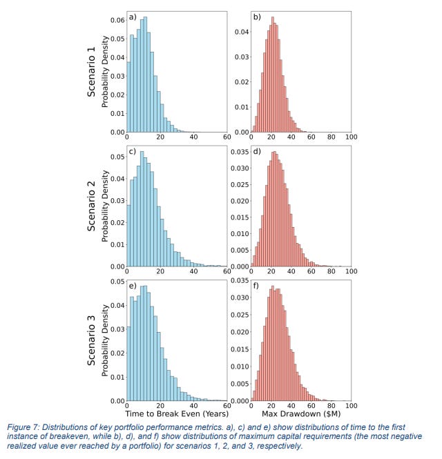 Lo and his collaborators have run extensive simulations demonstrating that this approach produces viable returns. Using historical oncology data from 1990 to 2011, they showed that a $5–$15 billion megafund could generate average annual returns of 8.9–11.4% for equity holders and 5–8% for debt holders, even accounting for the brutal attrition rates of drug development. Applied to fusion energy, simulations of a $10–$30 billion fund yielded projected returns of 7–12%, assuming moderate correlations between projects and occasional breakthroughs.