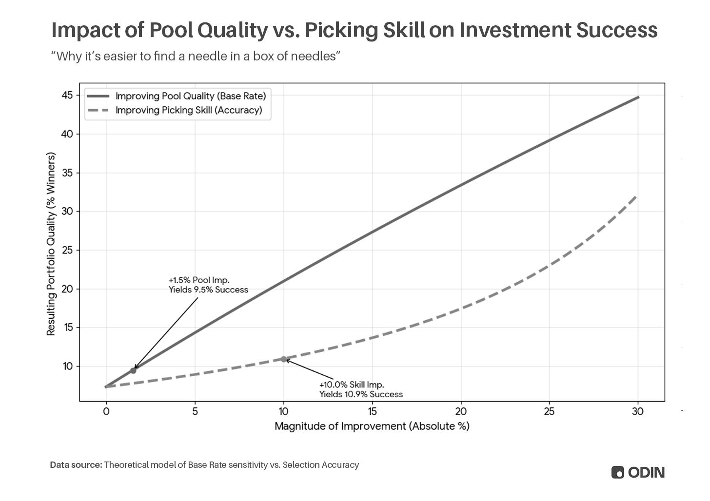There's a mathematical explanation for this: the success rate of investments is essentially a combination of pool quality and picking skill. Pool quality acts as a ceiling or constraint - you can't pick winners that don't exist in your pool.
