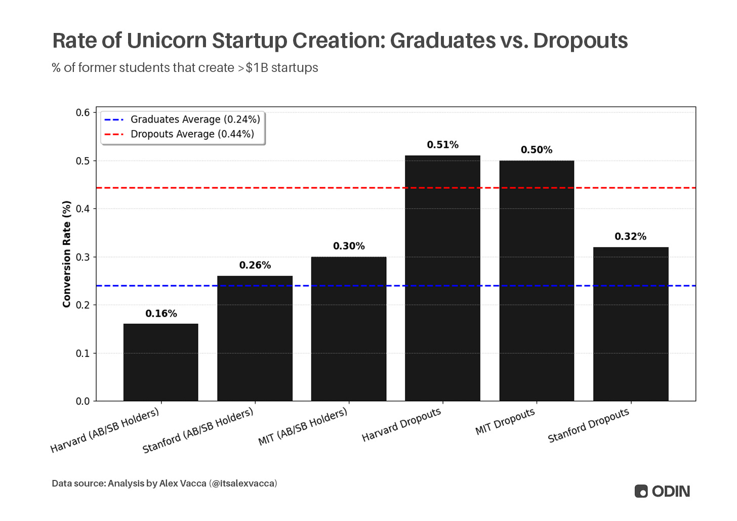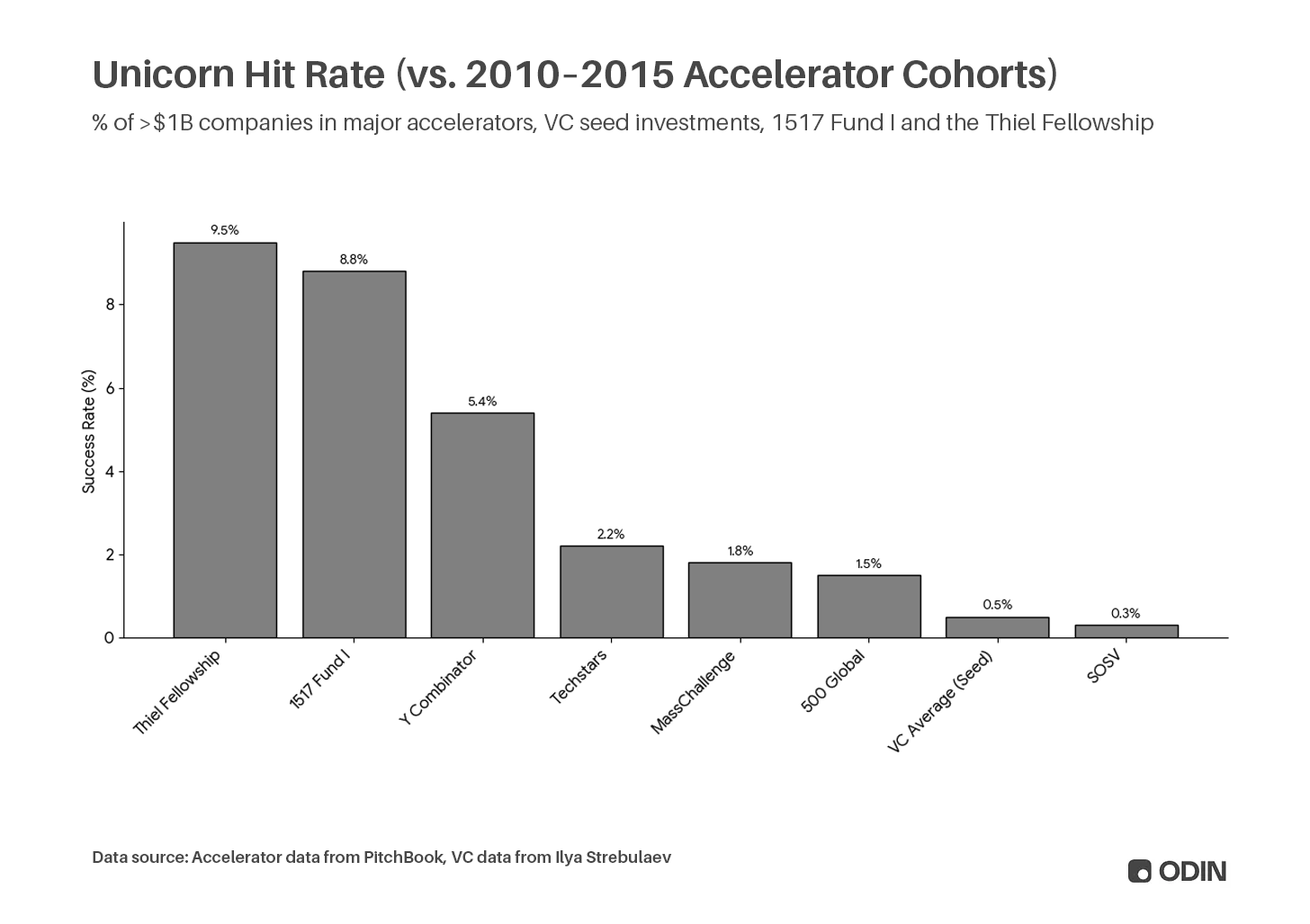 Bloomberg finance researchers Aaron Brown and Richard Dewey assessed the program in 2025, and concluded that every other elite scholarship program in the world, combined, could not match the output of Thiel fellows by age 35. The cumulative value created by fellows’ companies is estimated to exceed $750 billion, with about 40 unicorns from roughly 290 participants. The result is a unicorn rate of about 14%, which dwarfs the venture industry’s baseline by an order of magnitude.