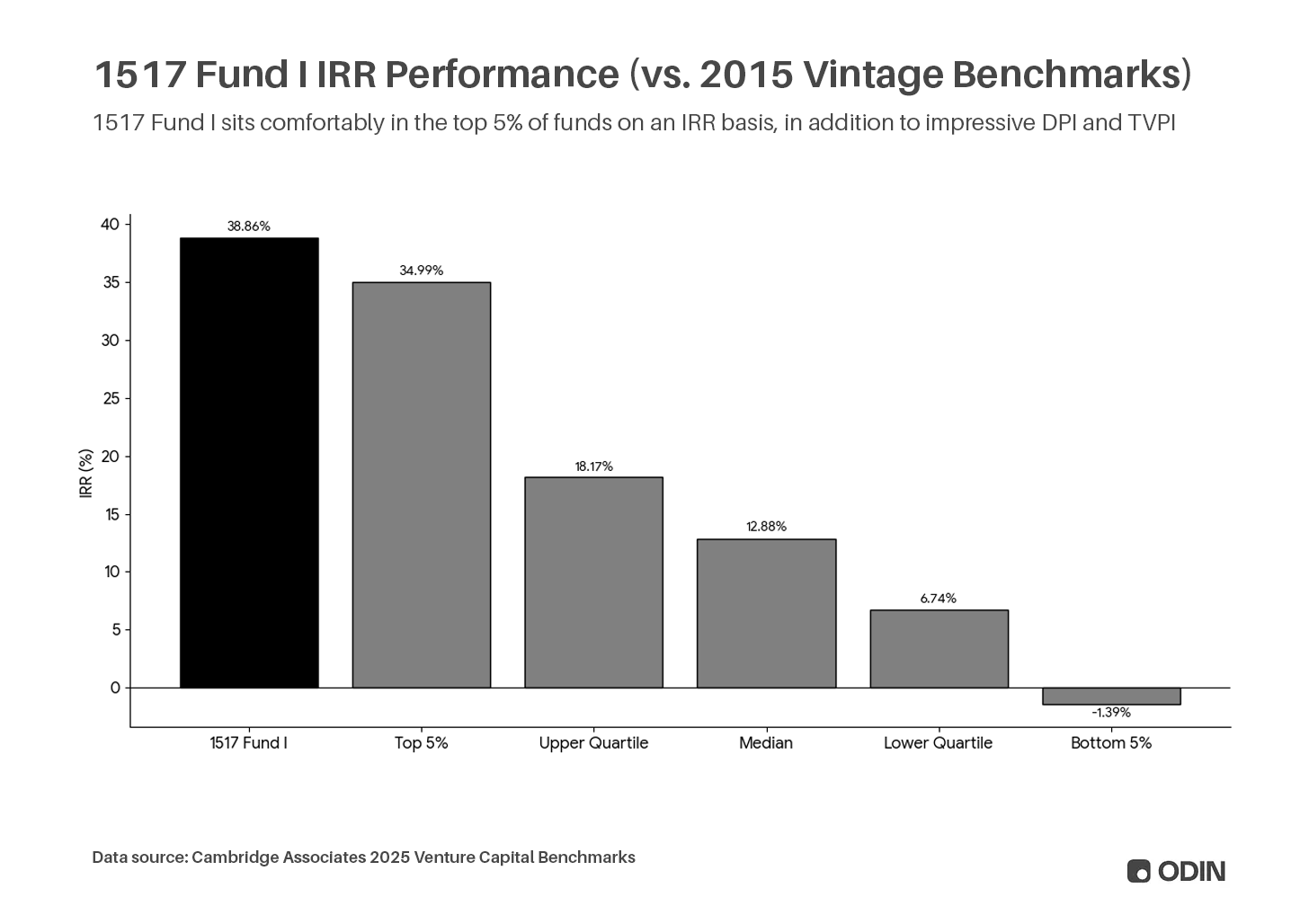Fund I’s internal rate of return is 38.86%. The Cambridge Associates benchmark for the top 5% of 2015-vintage venture funds is 34.99% (as of 2025). The total value to paid-in (TVPI) multiple of 9.65 times is roughly three to four times higher than even 90th-percentile funds from comparable vintages.