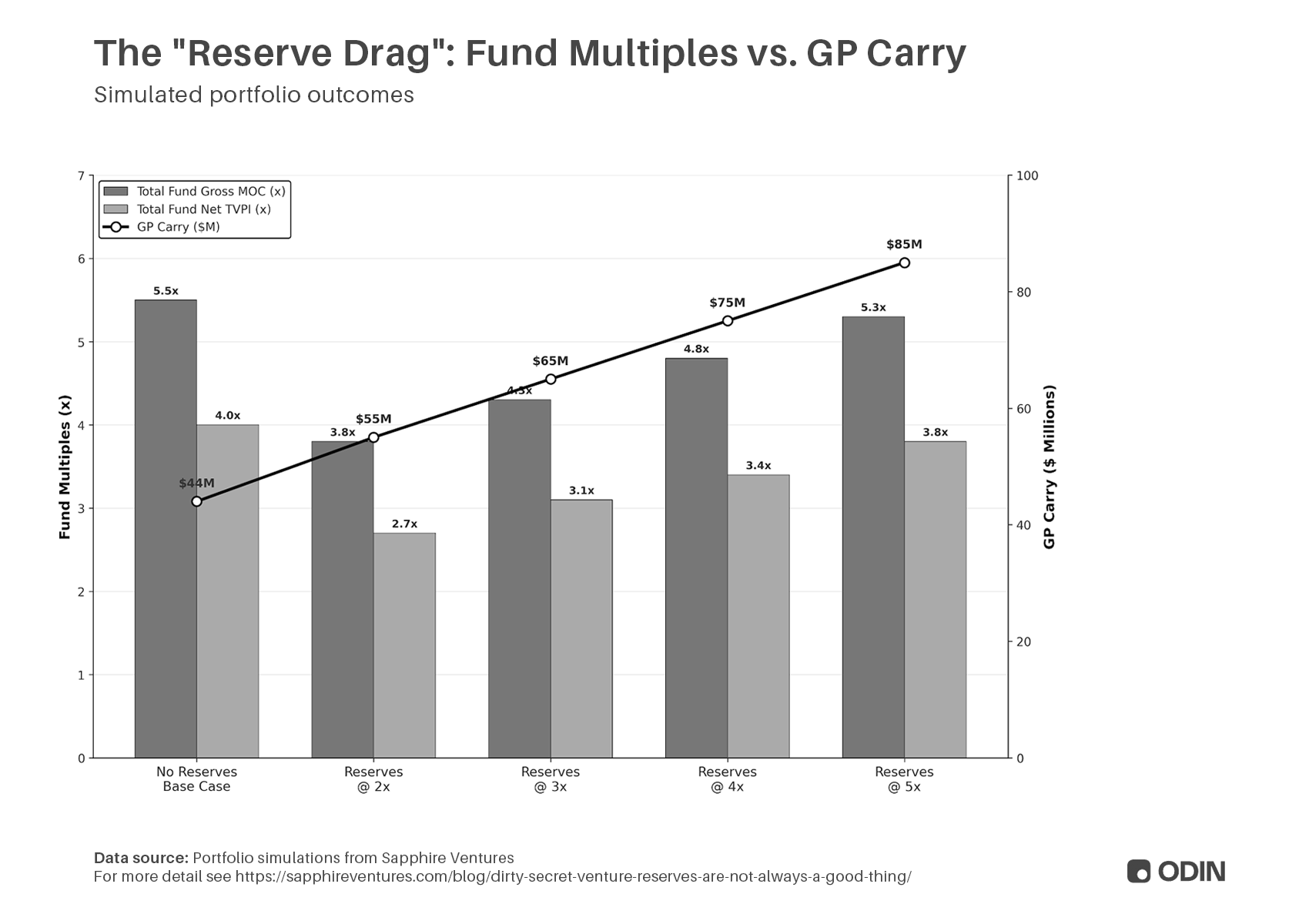 In the “Reserves @ 2x” scenario, the fund’s Net TVPI falls from a solid 4.0x to a mediocre 2.7x. Paradoxically, the GP’s carry increases by $11M, rewarding them for managing a larger, less efficient fund.