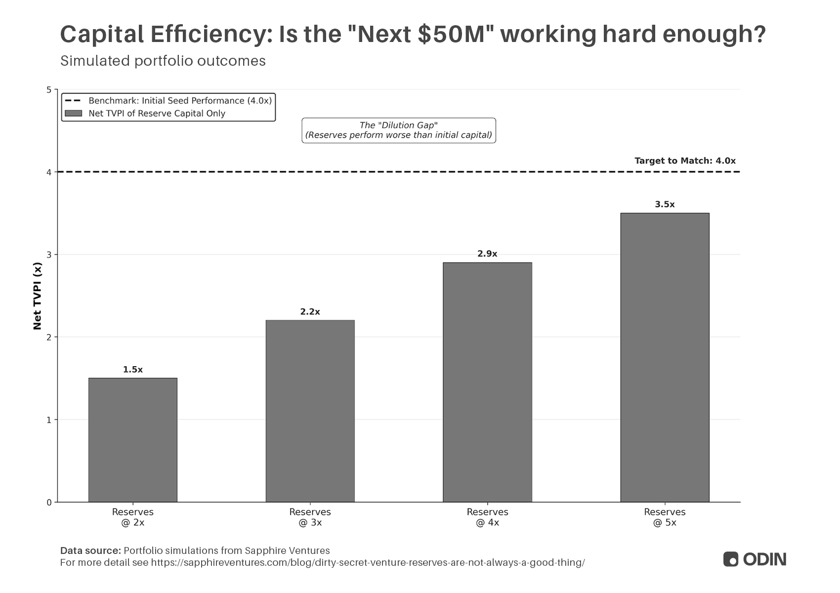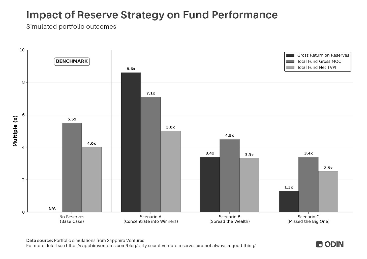 To break this down, we can take a closer look at the simulated portfolio data from Sapphire Ventures, illustrating how difficult it is improve fund performance by adding reserves:
