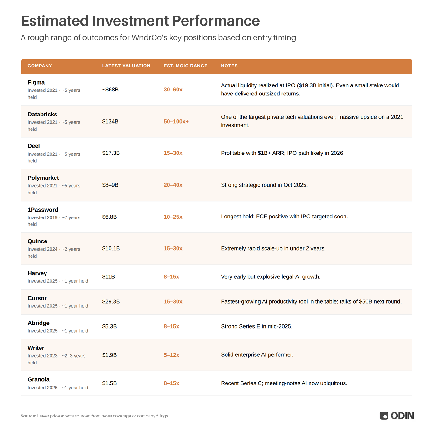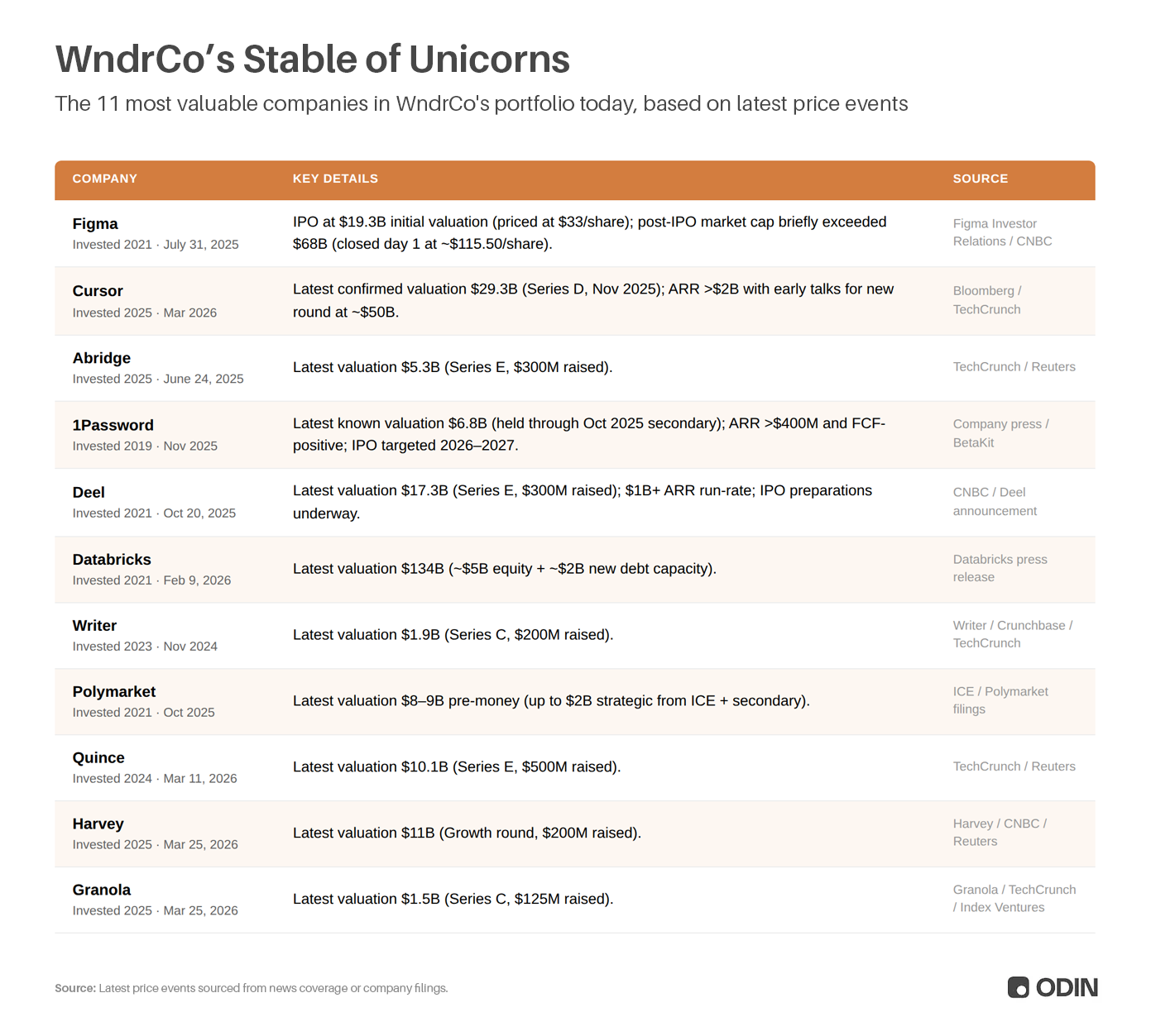 The WndrCo portfolio includes Cursor, the AI coding tool whose annual recurring revenue surpassed $2 billion in March 2026; Figma, which completed a blockbuster IPO in July 2025; Databricks, valued at $134 billion after a February 2026 raise; and Abridge, the medical AI company that doubled its valuation in four months.